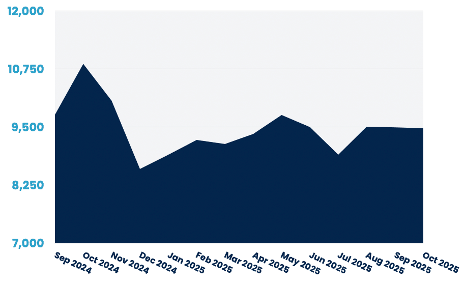 The US market held steady with 9,468 PM jobs, essentially flat (–0.2%) after September's 2.9% growth. Mid-level roles grew 2.6%, but senior positions fell 5.4% and leadership stayed nearly flat (+0.4%).